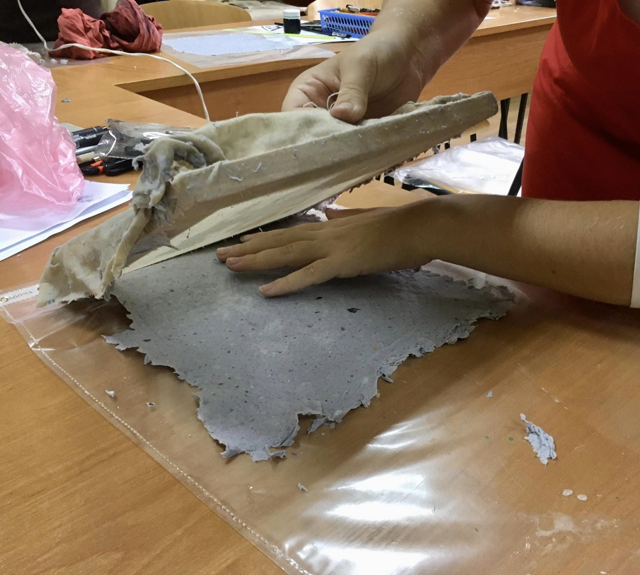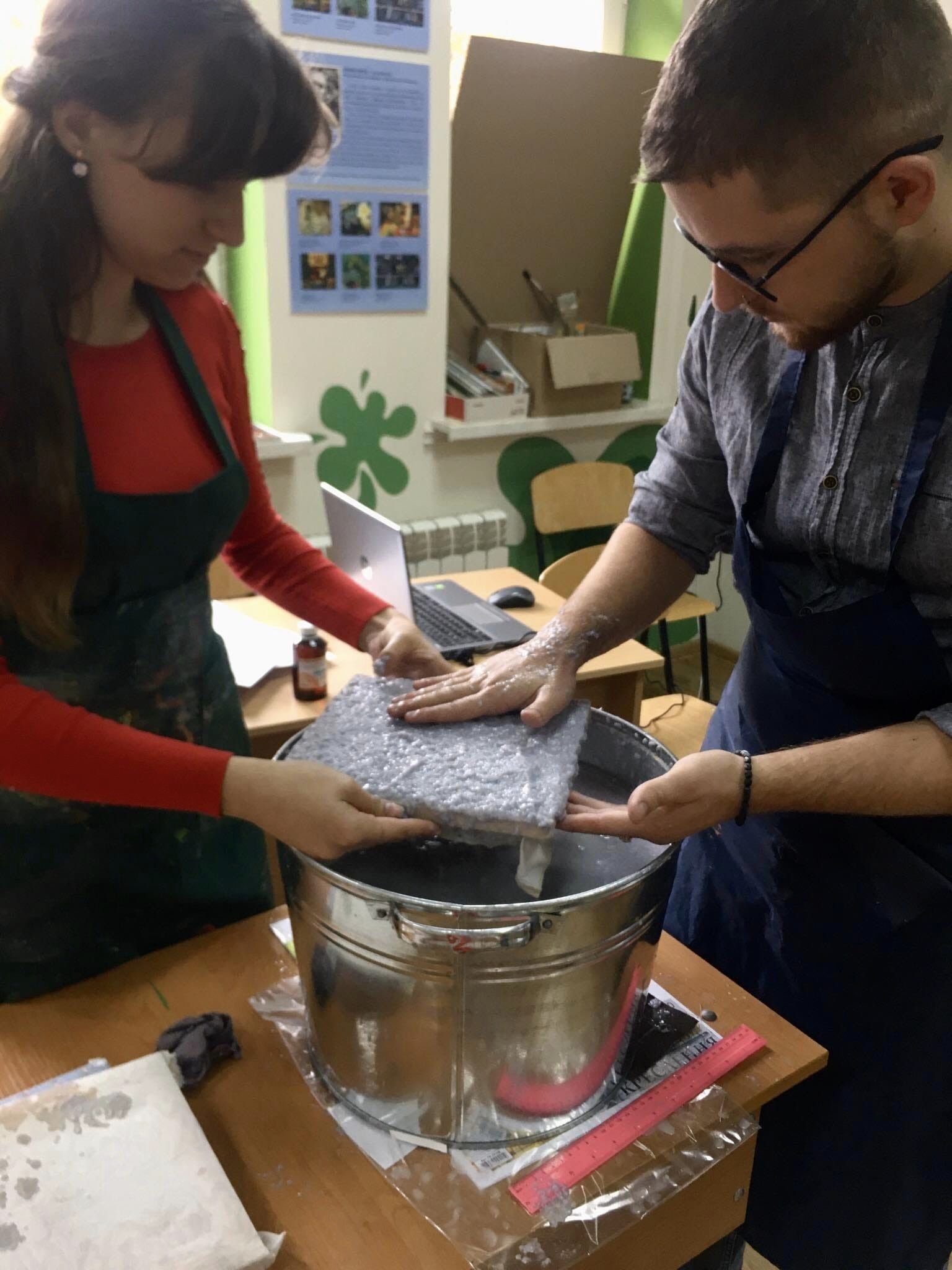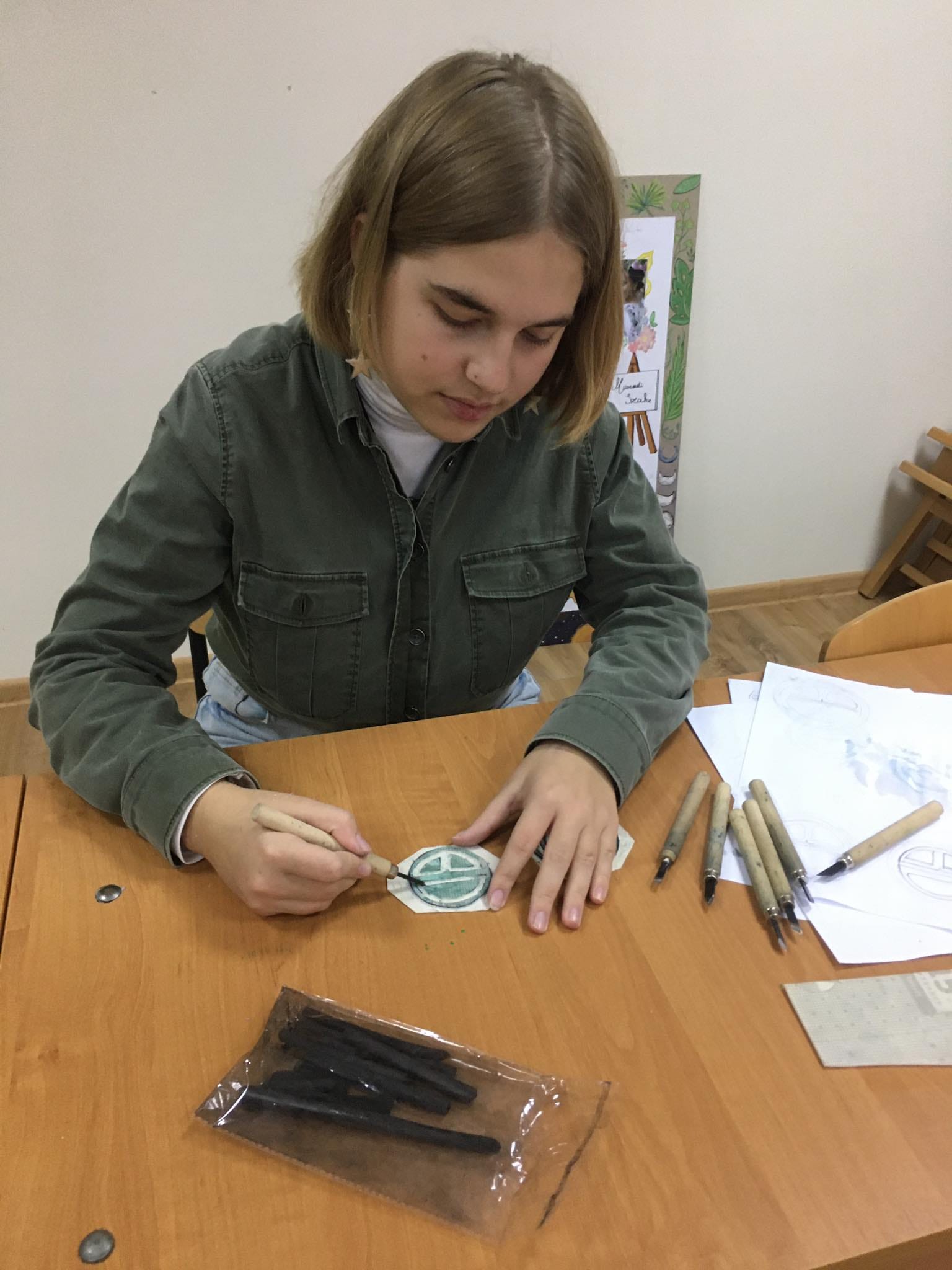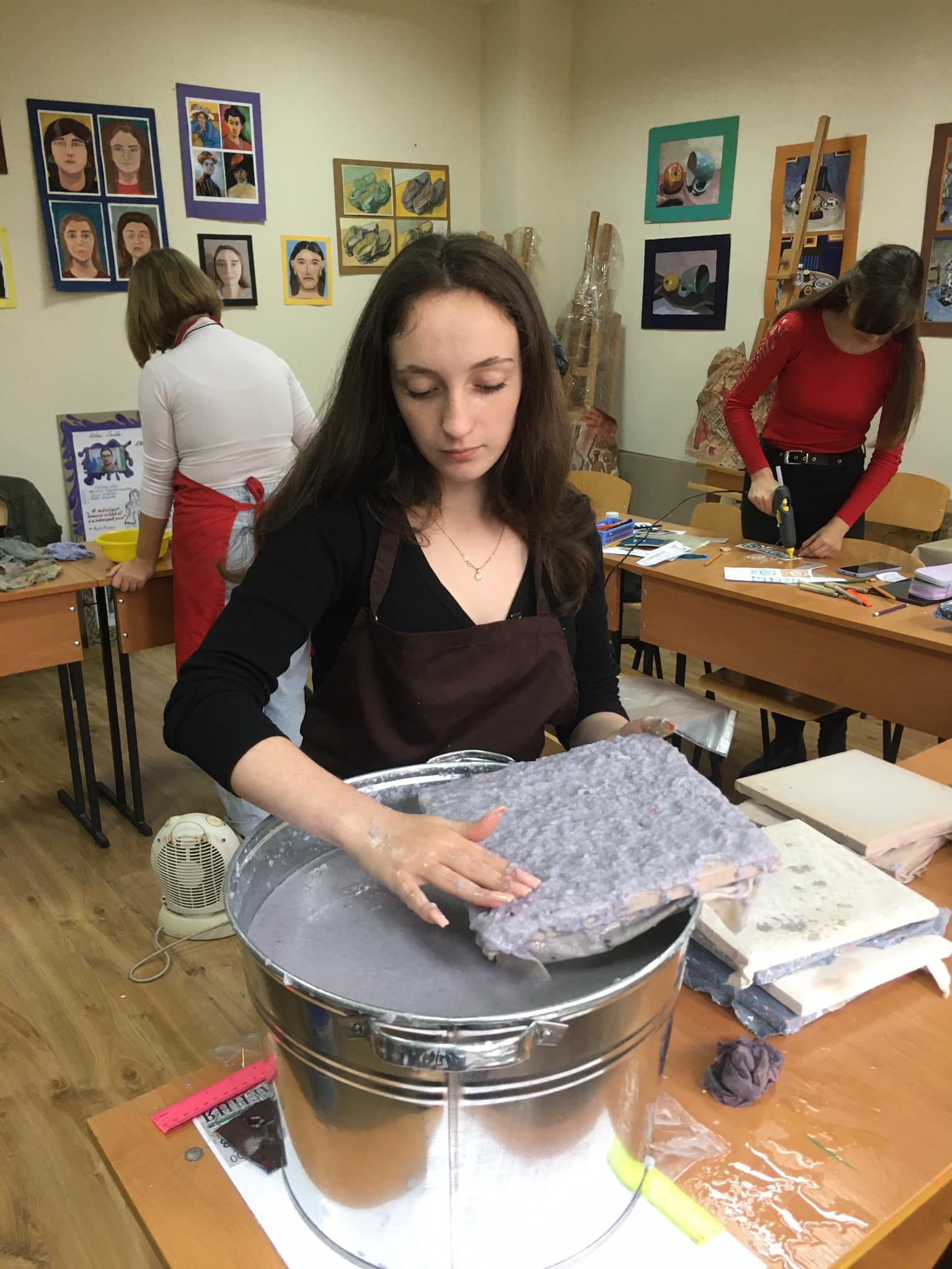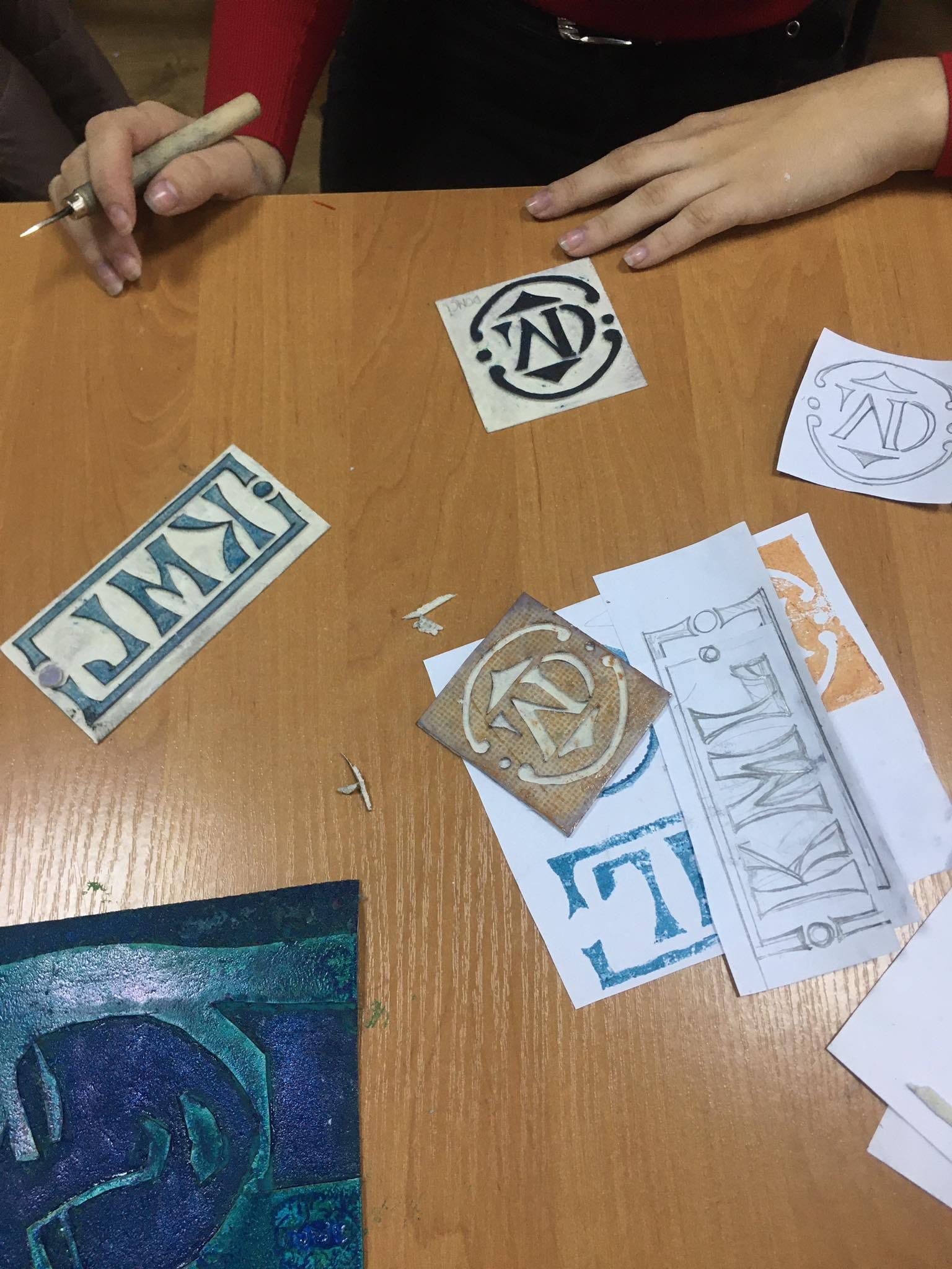 Újrahasznosított, merített papírkészítés a művészeti foglalkozáson, amire később díszes iniciálék lettek ráfestve és sajáttervezésű logók, amit linómetszetbe kifaragtunk pecsétnek.