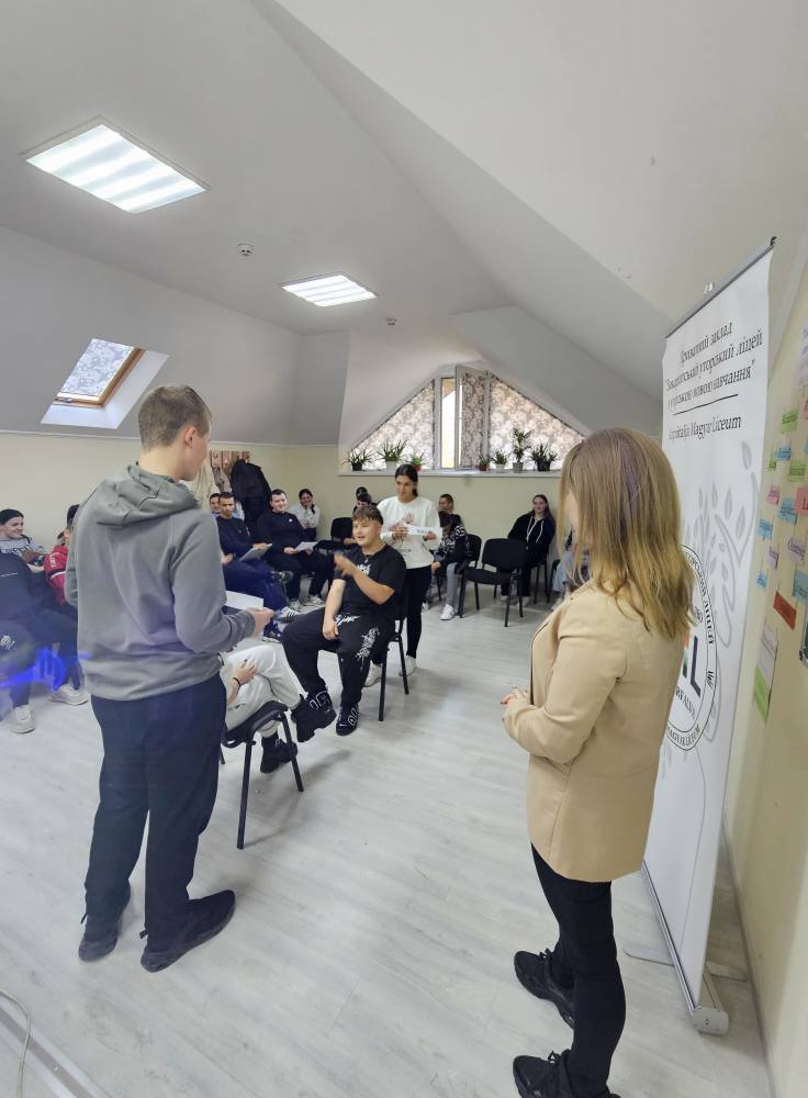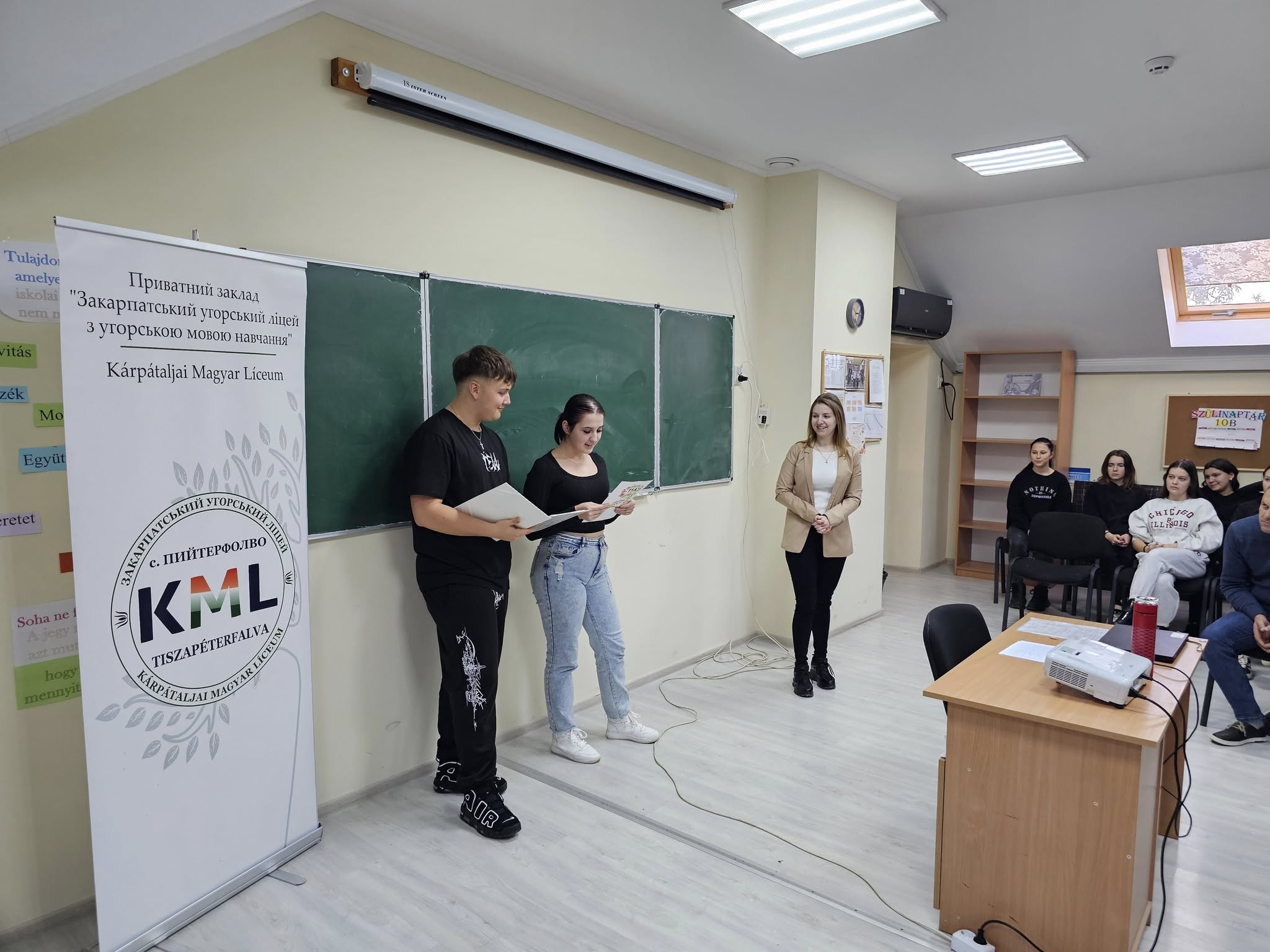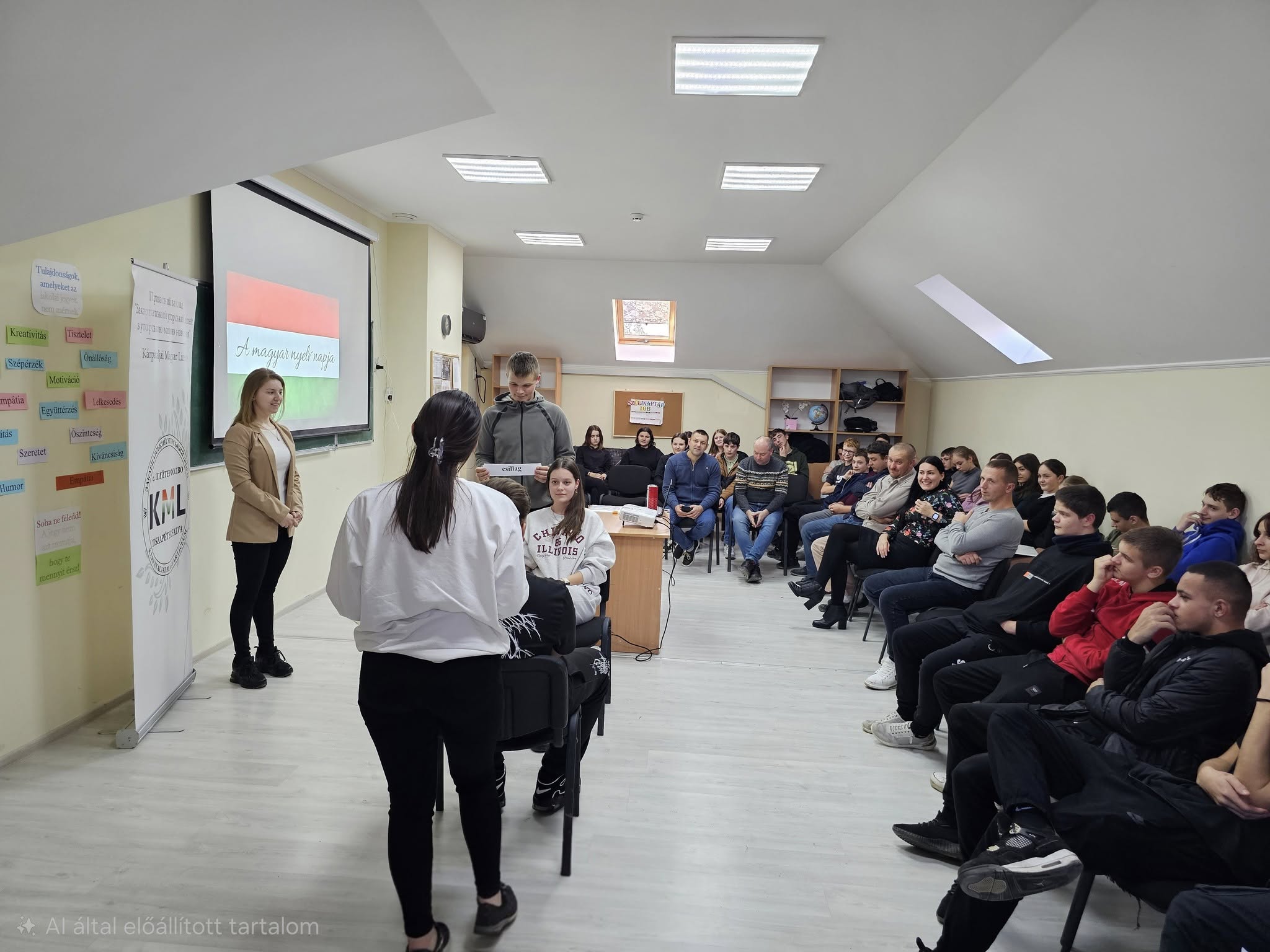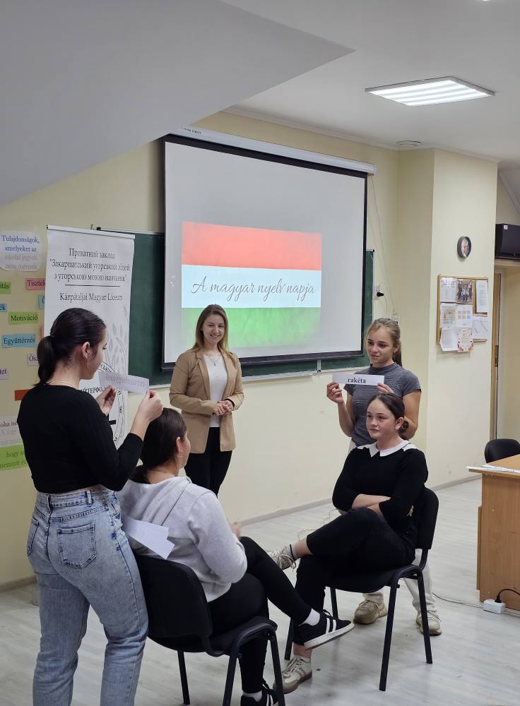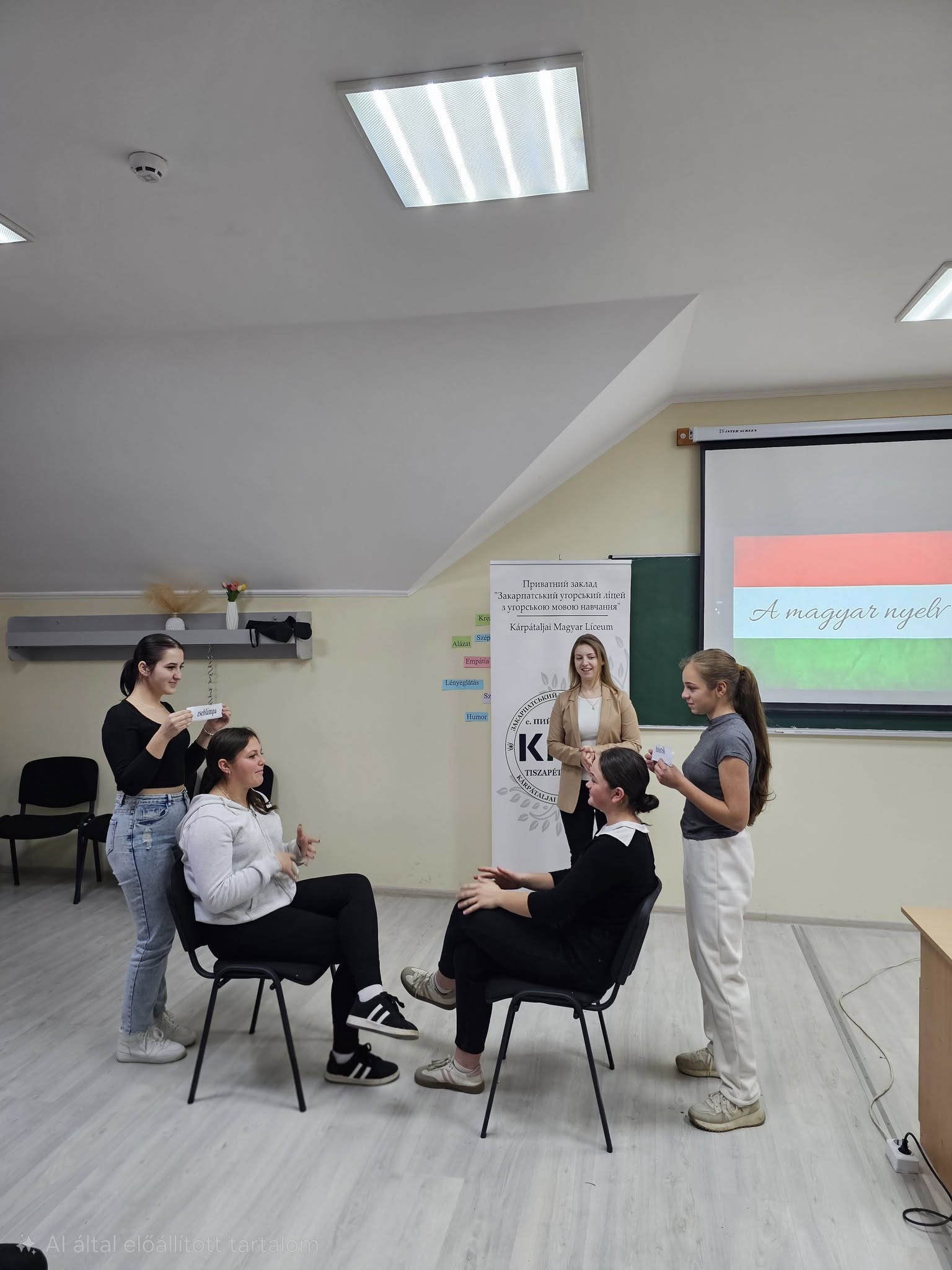 Az interaktív foglalkozás keretén belül szituációs párbeszéd által építettek be diákjaink különböző szavakat a beszélgetésükbe, valamint az akasztófa játék segítségével foglalkoztunk több anyanyelvünkhöz köthető szó kitalálásával, rácsodálkozva mindeközben nyelvünk páratlan voltára. ![]()
