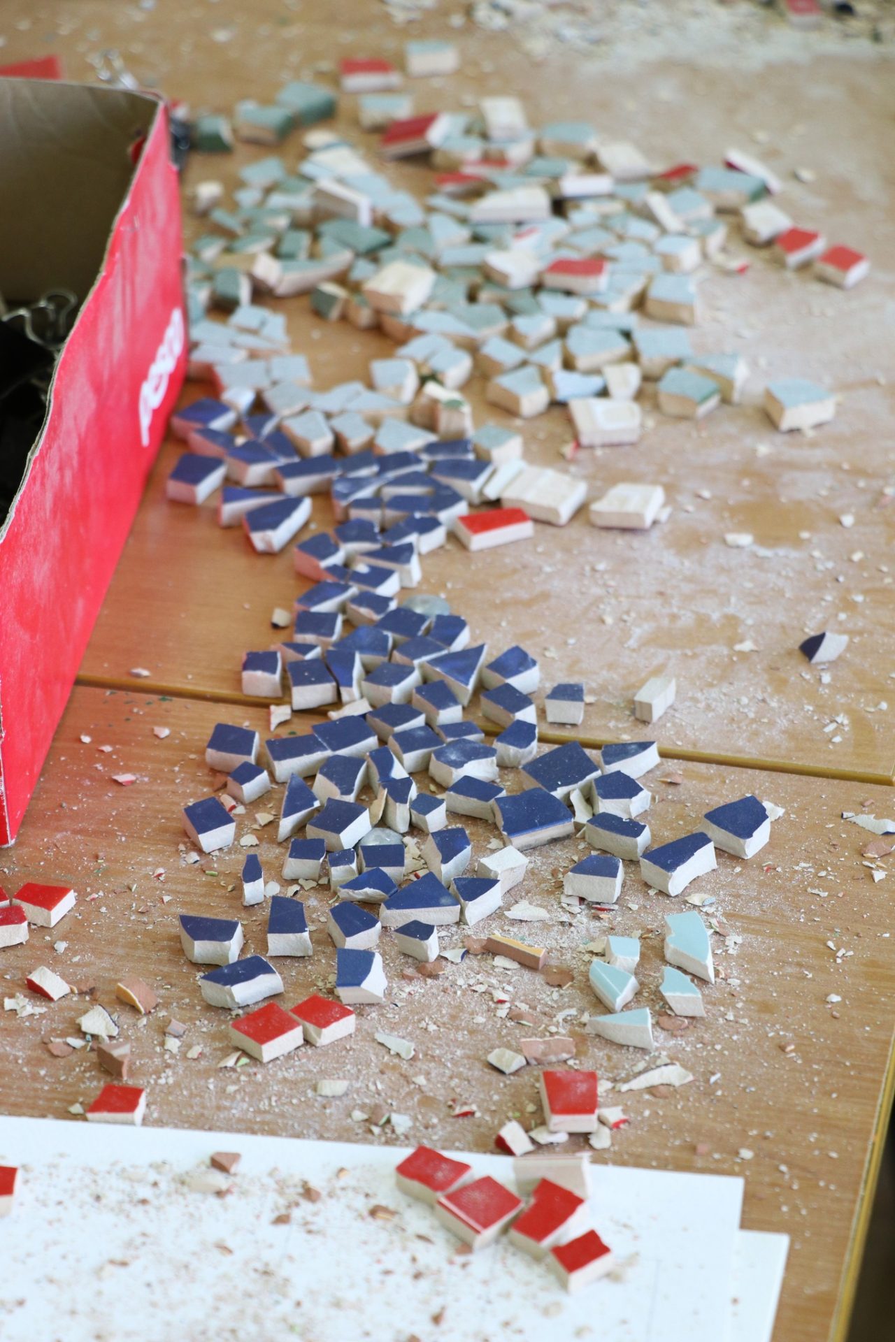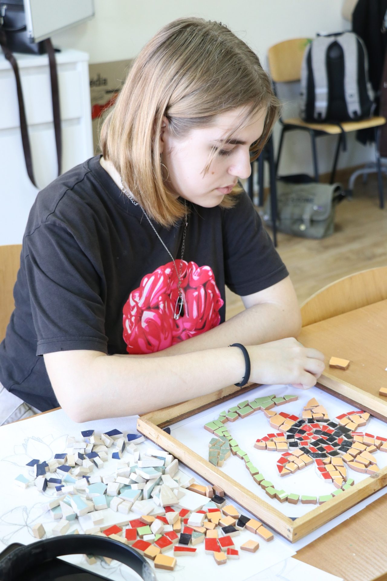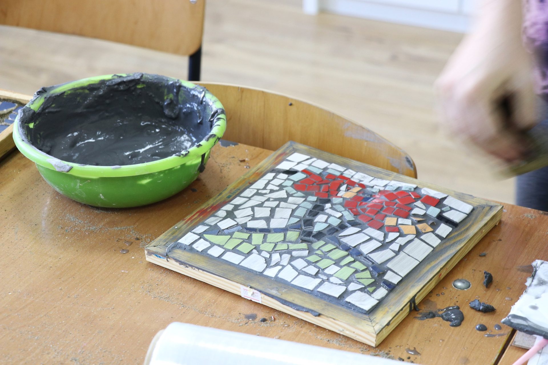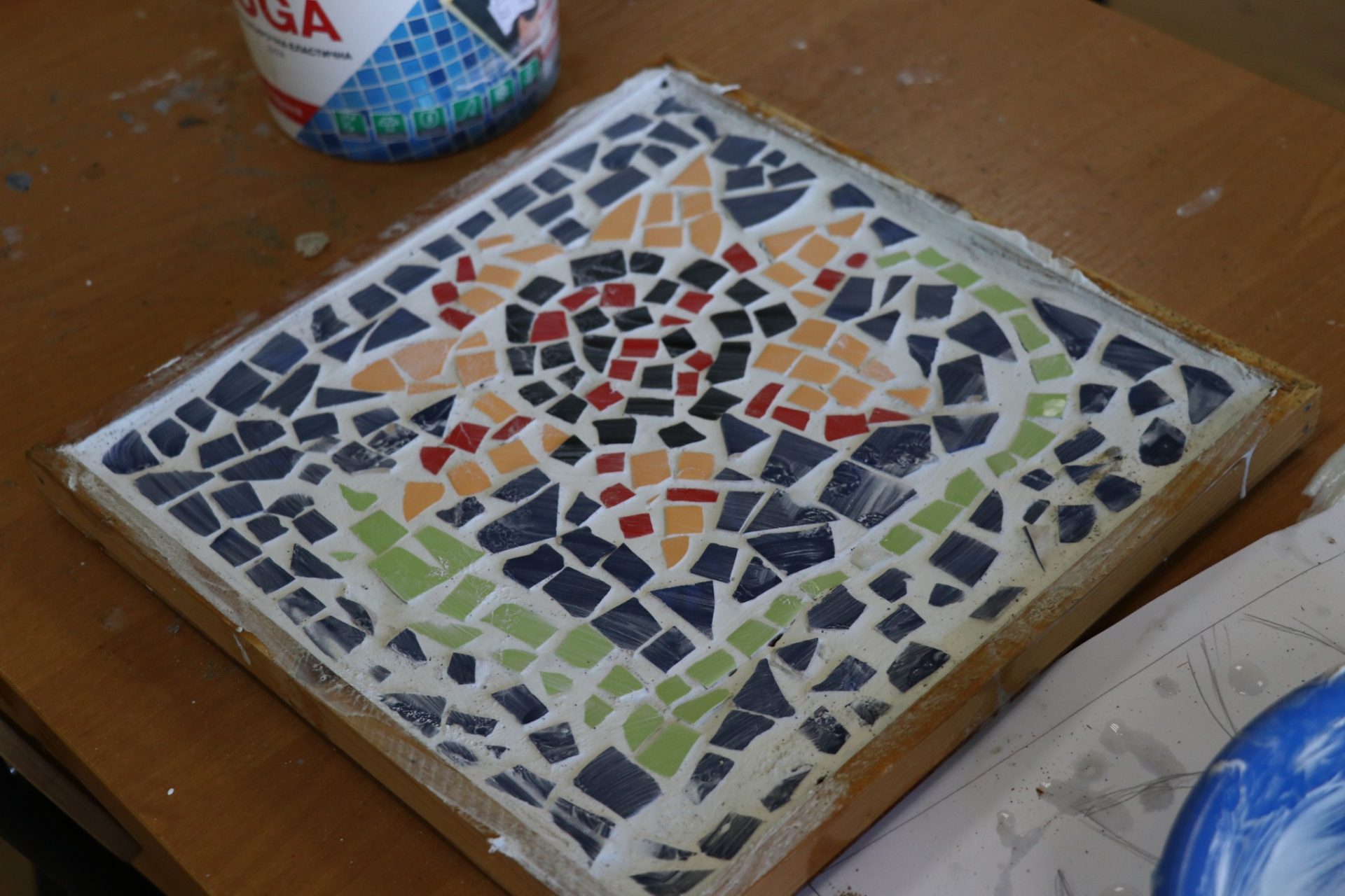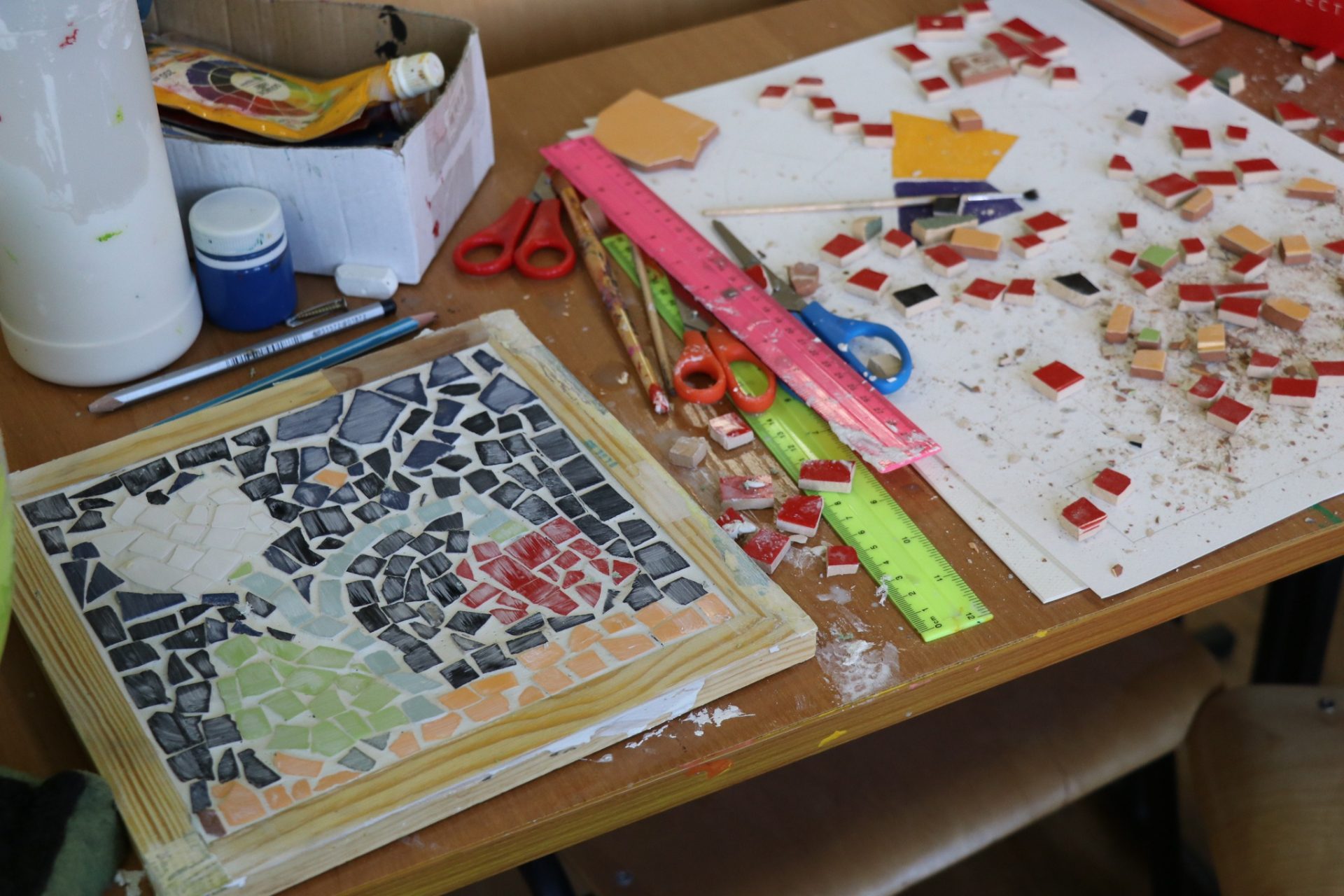 “Мозаїка” – це вид мистецтва, в якому розташовуються дрібні фрагменти для створення більшого зображення або візерунка. Для цієї мети ми обрали керамічні плитки різних кольорів. Незважаючи на те, що це була трудомістка робота, ми насолоджувалися кожною хвилиною.